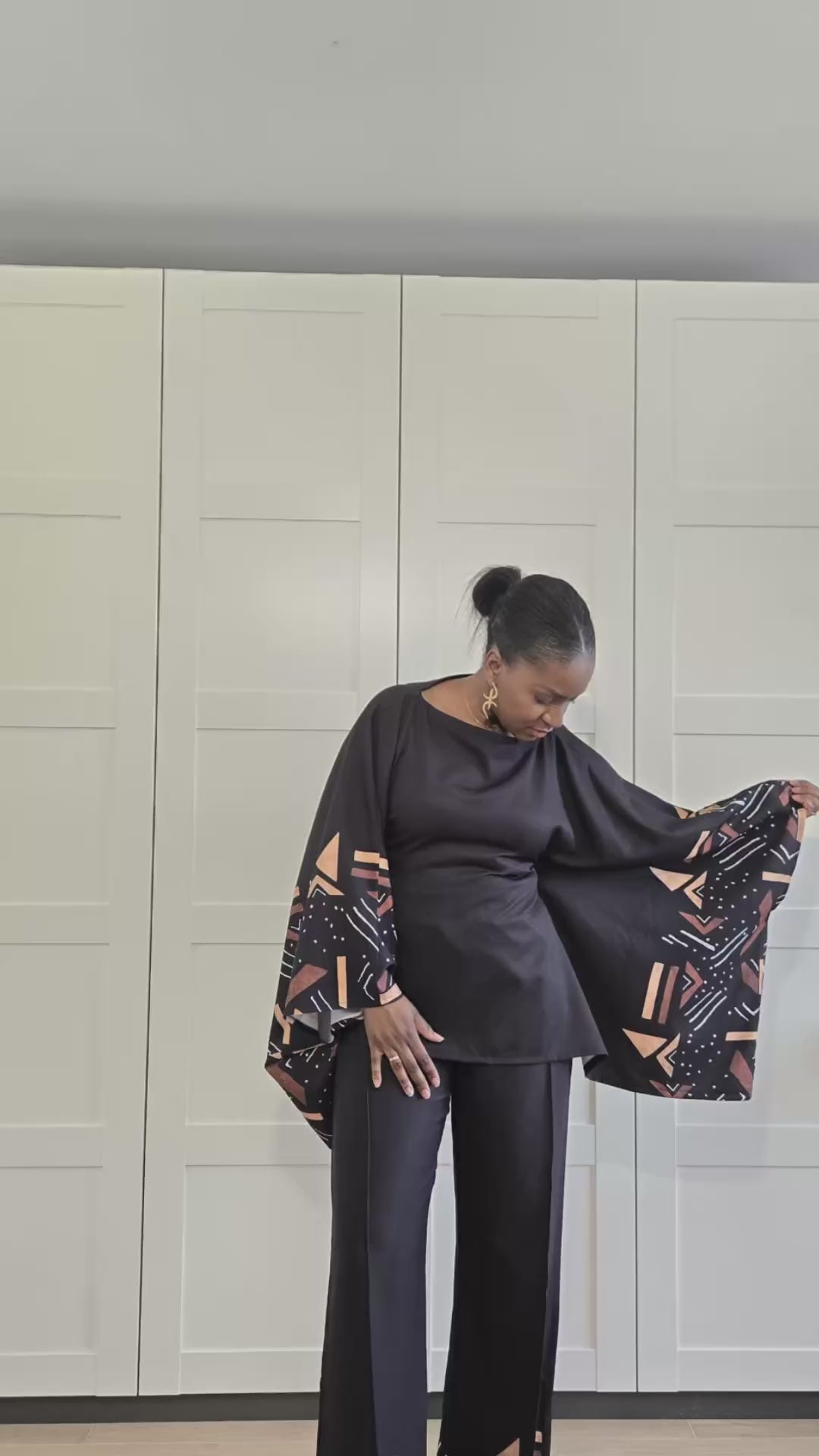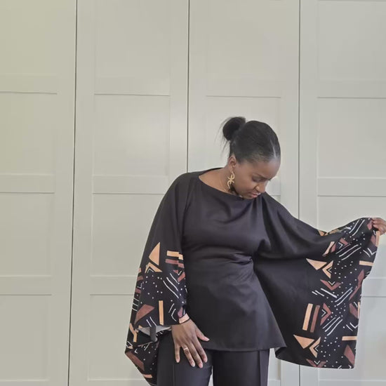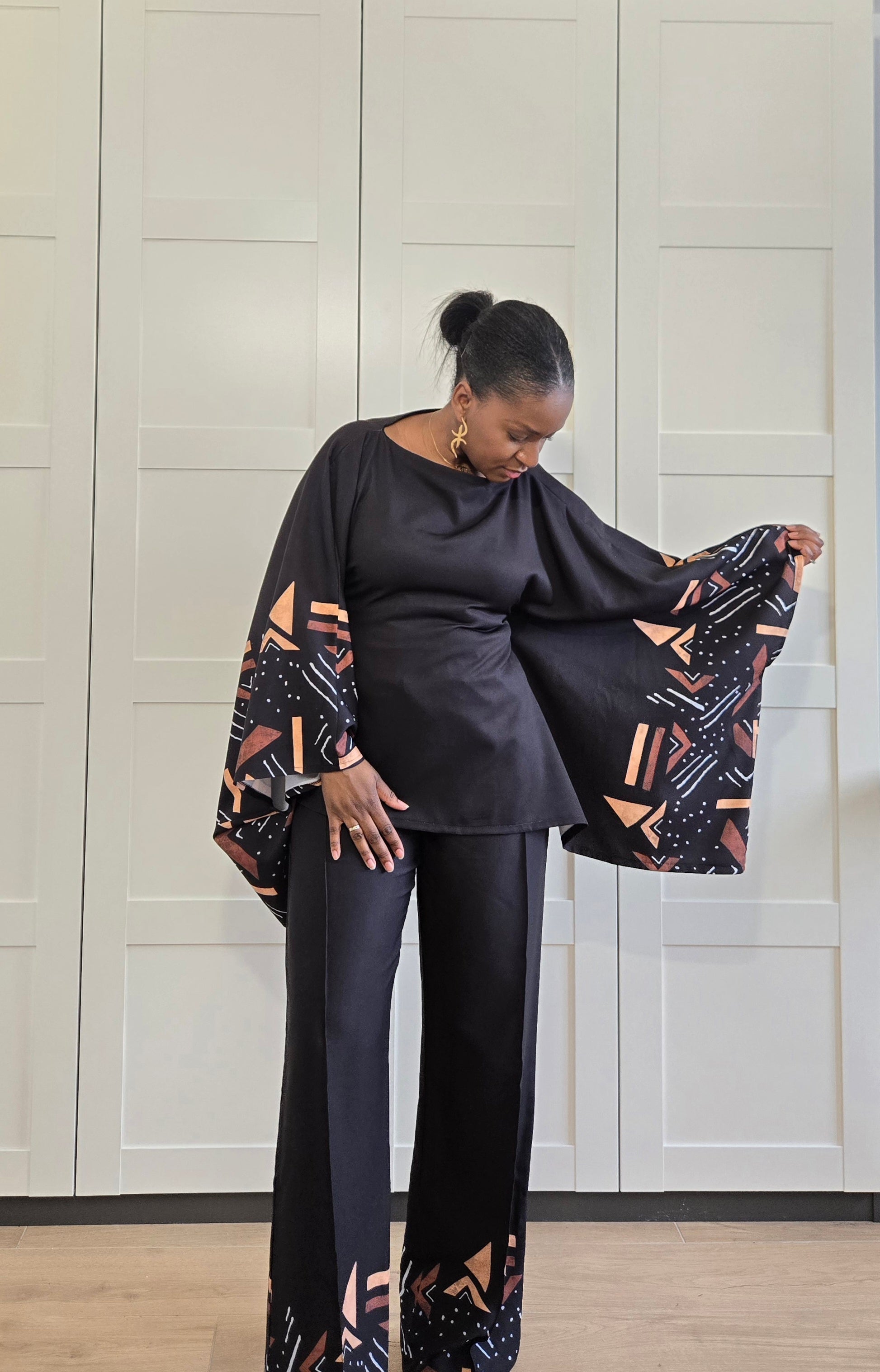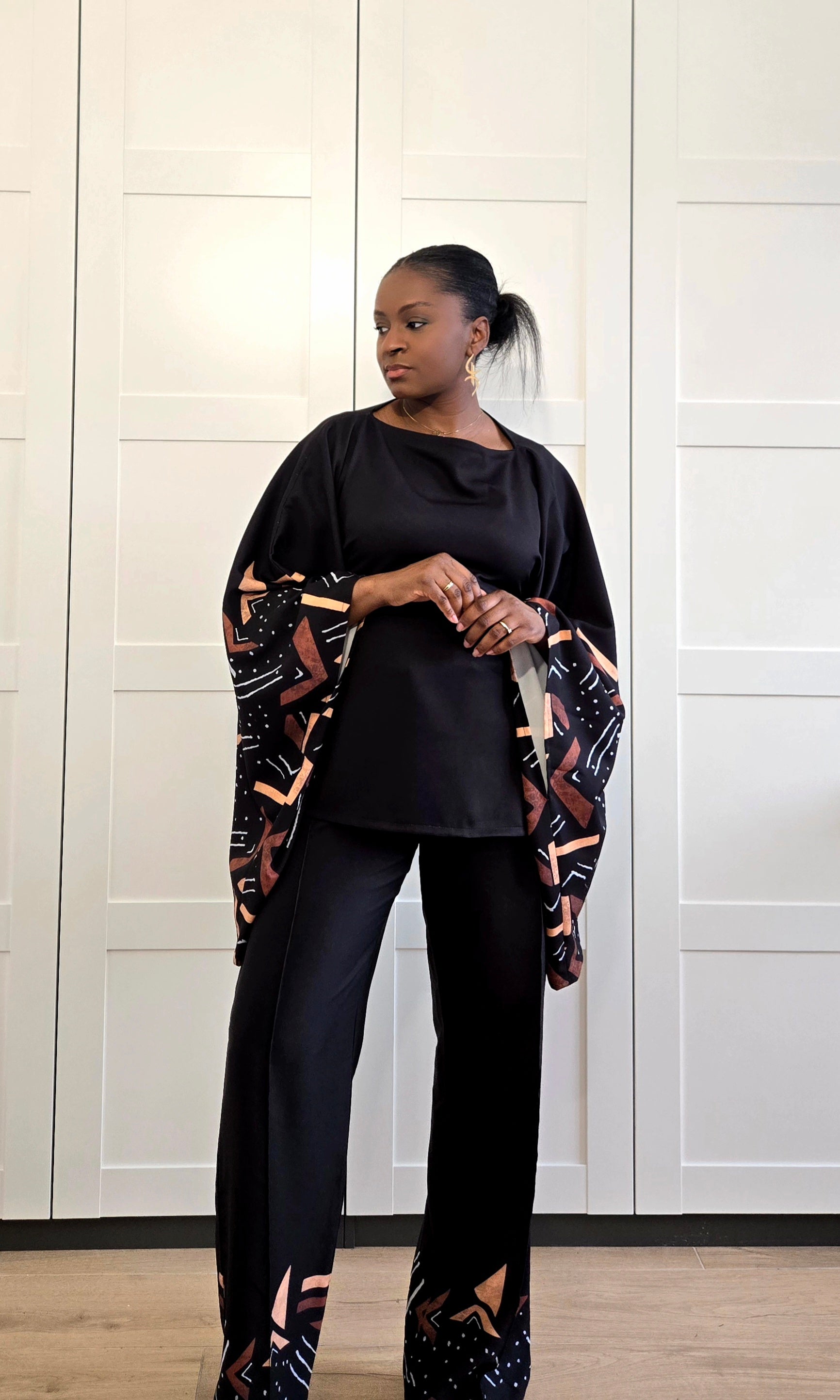 Elégant, moderne et pensé pour sublimer, cet ensemble noir bogolan est parfait pour les femmes en quête de style et de confort. Le haut, fluide et chic, est accompagné d’une ceinture à nouer à la taille permettant d’ajuster le volume selon l’envie et de mettre la silhouette en valeur. Ses manches amples façon kimono sont sublimées par des motifs bogolan.